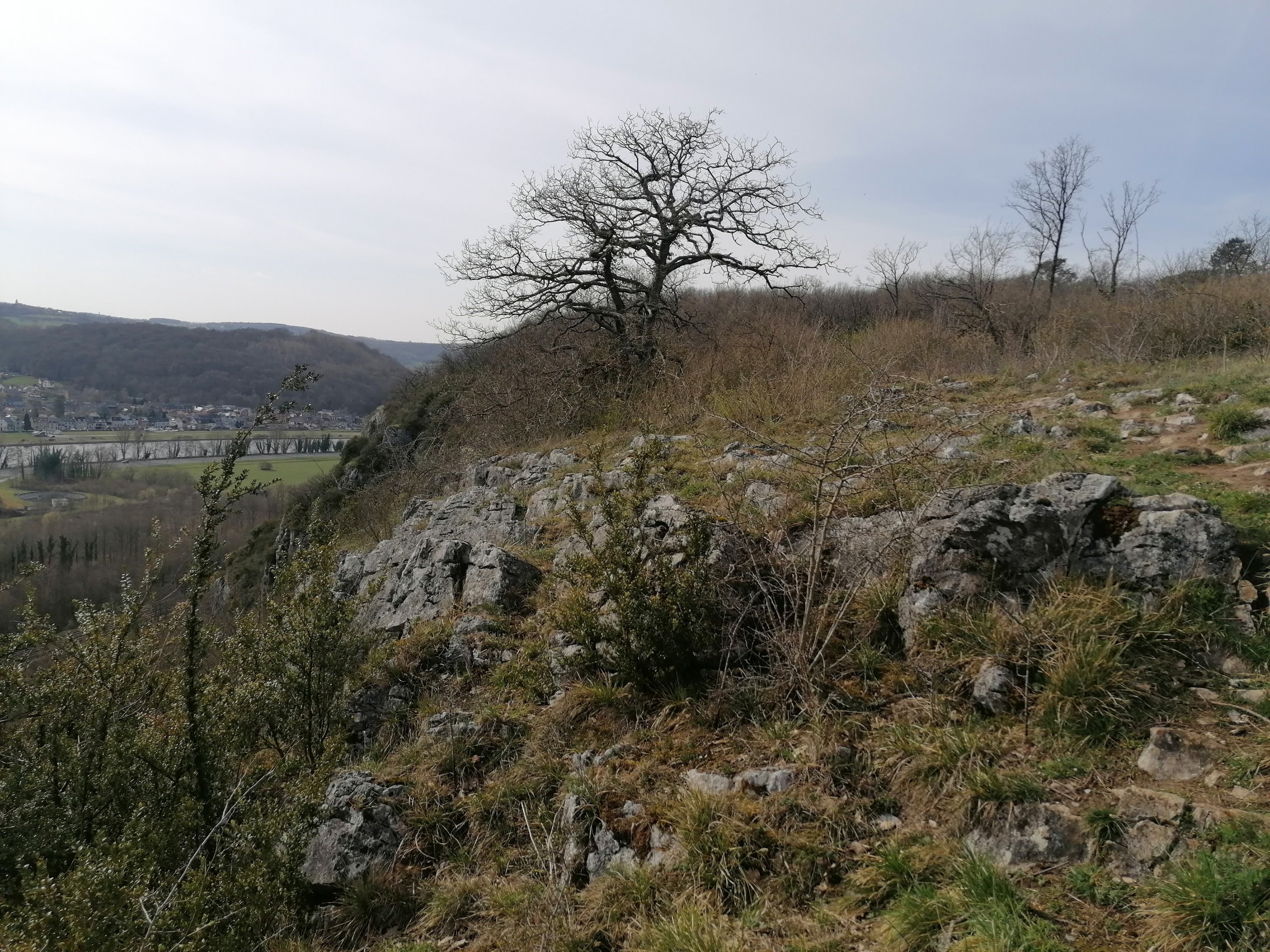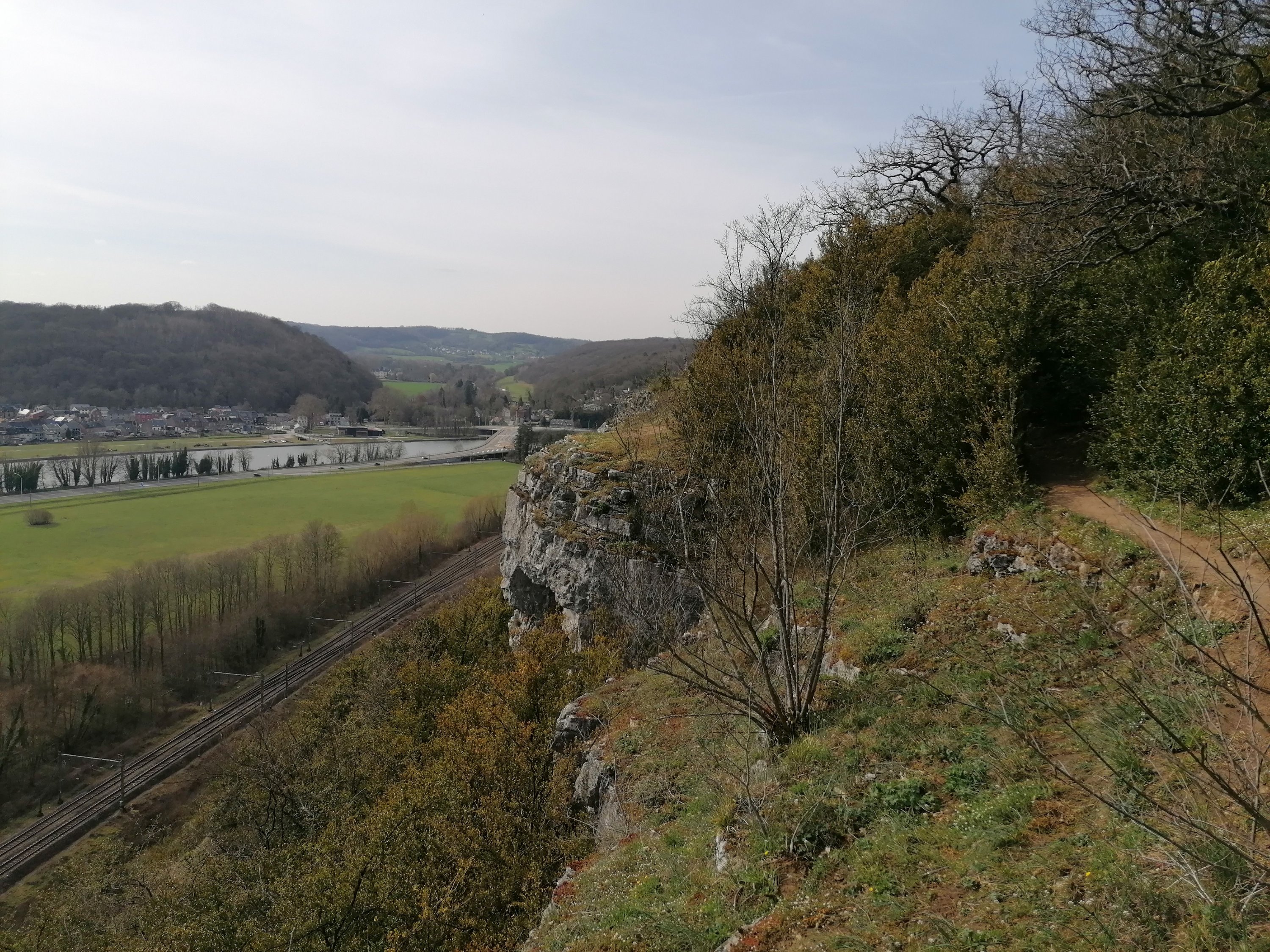La suite de la randonnée nous mène vers la réserve naturelle de Champale que nous traversons sur un sentier à flanc de roche avec une vue imprenable sur la Meuse. Attention au vertige…