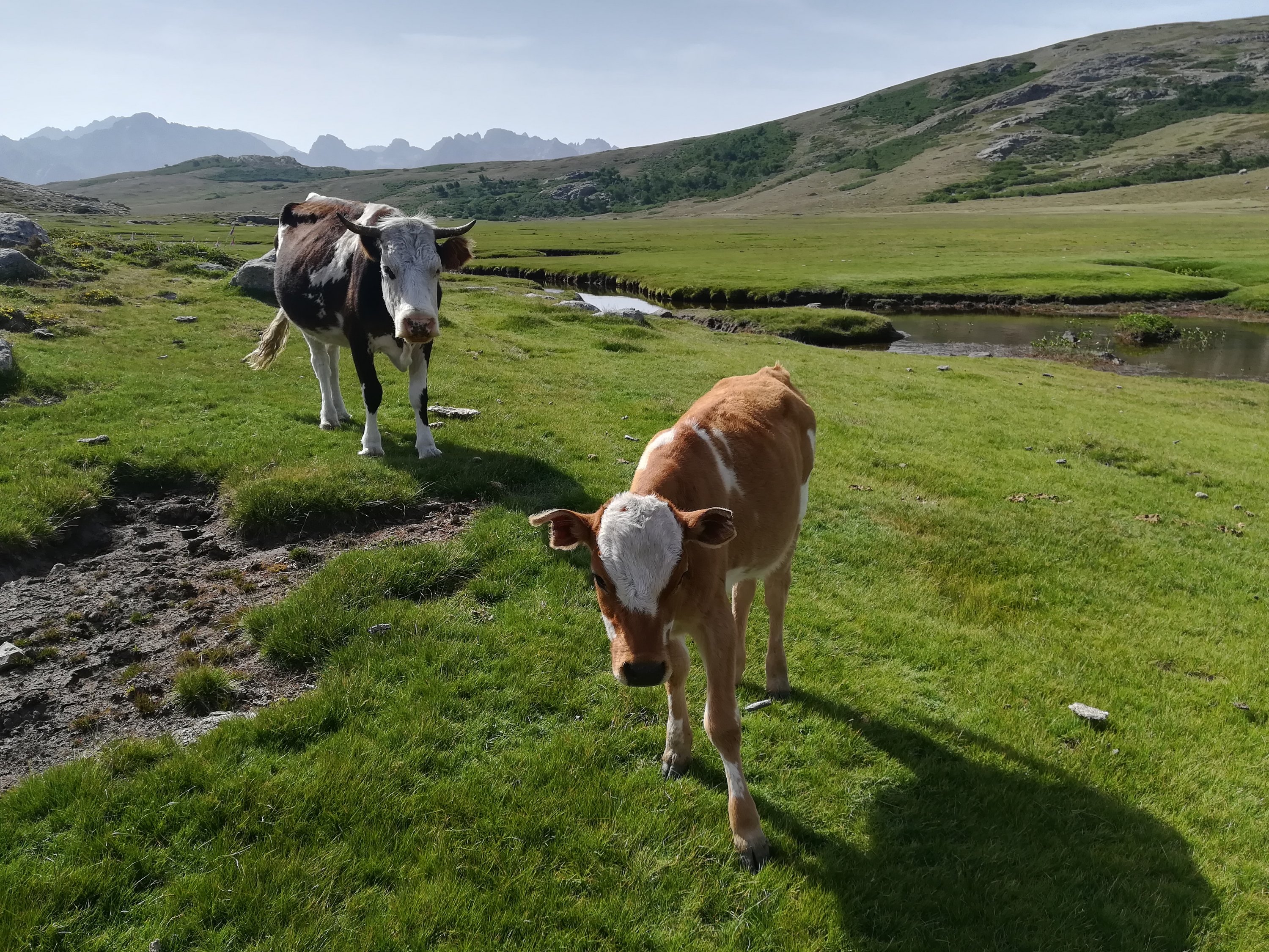 La journée démarre sous le soleil cette fois. Après la traversée des Contamines, nous arrivons à la chapelle de Notre dame de la Gorge puis commençons l’ascension vers le refuge de Nant Borrant où nous profiterons pour nous désaltérer près du torrent. Nous continuons à grimper doucement vers de plus hauts sommets et rencontrons nos 1eres vaches alpines. De magnifiques panoramas s’offrent à nous. Nous sommes heureux d’avoir attendu cette matinée ensoleillée et de ne pas avoir raté ces vues hier.